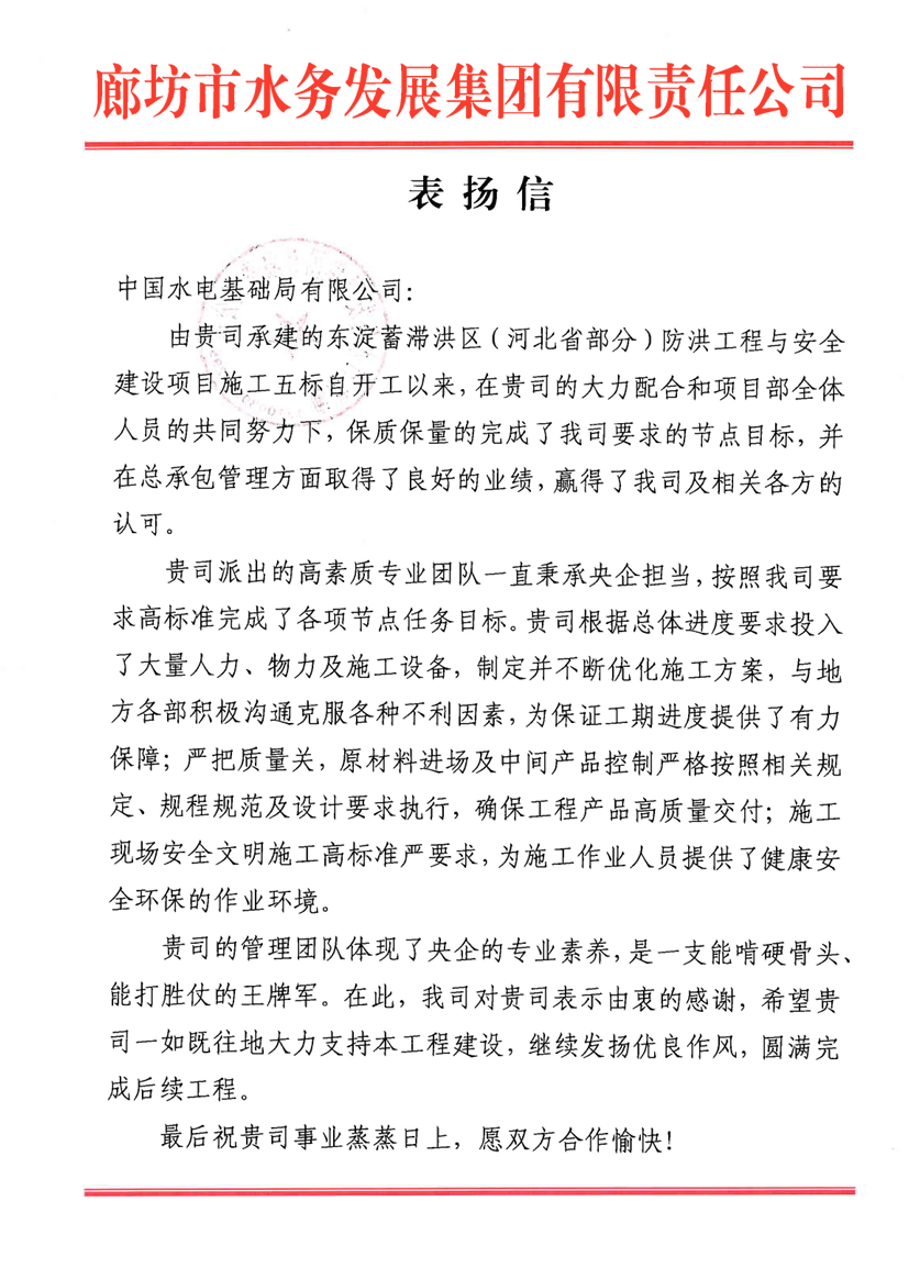 近日,东淀蓄滞洪区(河北省部分)防洪工程与安全建设施工五标项目收到业主单位廊坊市水务发展集团有限责任公司的表扬信,对项目团队在建设过程中展现出的专业能力、责任担当和高效协同给予高度赞扬。