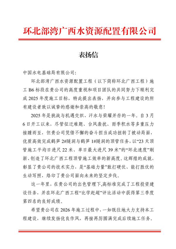 1月9日,公司承建的环北部湾广西水资源配置工程施工B6 标项目,收到业主单位环北部湾广西水资源配置有限公司发来的表扬信。 信中对公司及项目团队在2025年顽强拼搏、攻坚克难,圆满完成B6标项目年度施工目标表示高度赞扬,并向全体参建人员致以诚挚感谢与崇高敬意。 项目自3月6日开工以来,尽管征迁难题、深基坑挑战、台风袭扰、雨季积水及土方淤积等多重压力接踵而至,但项目团队科学研判形势,多次优化施工设计,细化技术方案,实行精细化管理,层层压实安全责任、环环紧扣工程质量,成功扭转了被动局面,交出亮眼答卷。在质量、安全、进度等多个方面,始终秉持认真负责态度,不仅坚守“零质量问题,零安全事故”红线,先后优质高效完成鹤笋2#隧洞与鹤笋1#隧洞顶管任务,更是创造“23天顶管施工平均日进尺22米、单日最大进尺39米”的“环北速度”。 环北B6标项目全体成员将以更加昂扬的姿态、更加过硬的作风、更加精细的管理,投入到后续建设任务中,为全面实现环北部湾水资源配置工程建设目标再立新功。 【责编:马思然】 |